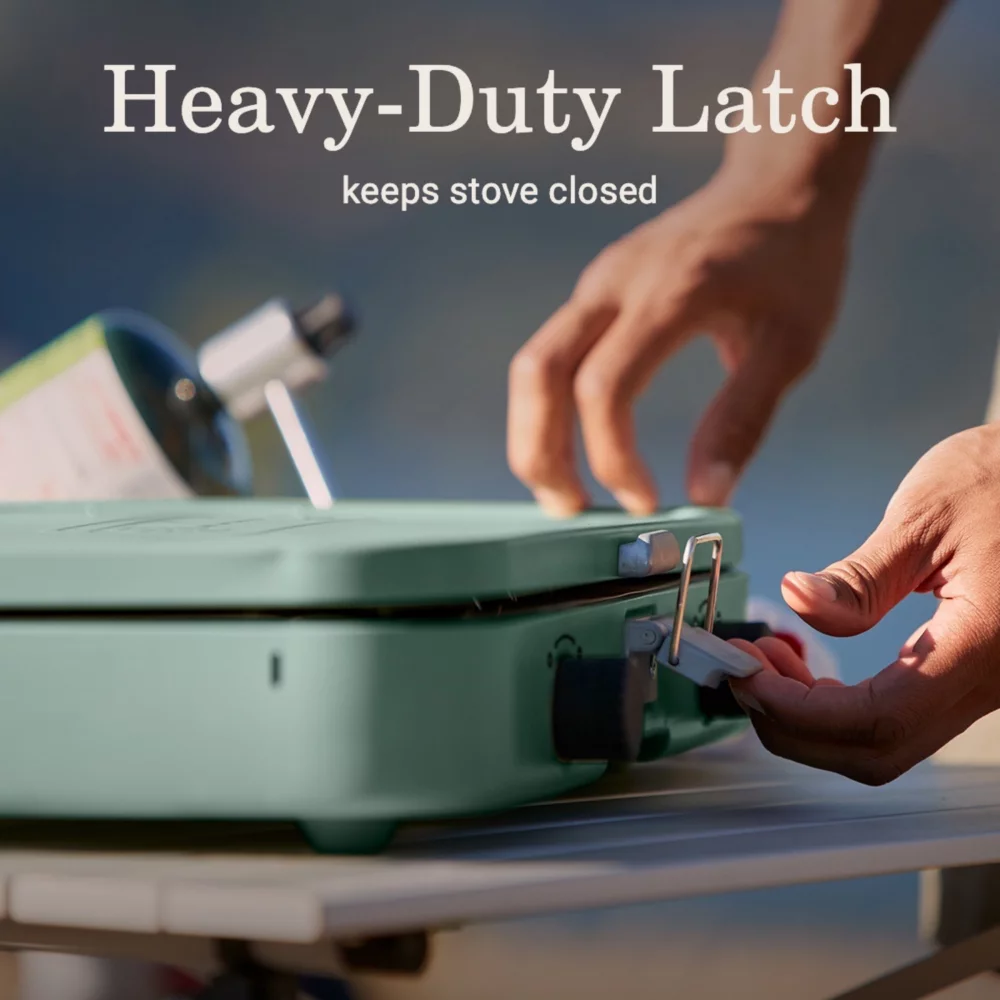 - PORTABLE: Recessed carry handle and secure space to store regulator makes stove easy to transport; heavy-duty latch keeps the stove closed while traveling