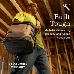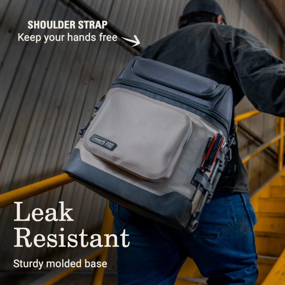 Coleman Pro is gear that works hard like you. It is purpose-built for everyday use in the most demanding environments. The Coleman Pro 24-Can Soft Cooler will keep your lunch and drinks for the crew cold all day. A separate dry storage compartment is a handy spot to store keys, phones, and more. Built tough, the durable exterior is puncture resistant and backed by a 3-year limited warranty. The antimicrobial treatment to the interior helps protect it from odor causing bacteria while a compression molded base protects the soft cooler to help prevent leaks. Throw the Coleman soft cooler over your shoulder to keep your hands free to carry toolboxes or fishing gear. Work smarter, not harder with oversized zipper pulls for easy access in work gloves and reflective molle webbing for extra storage.