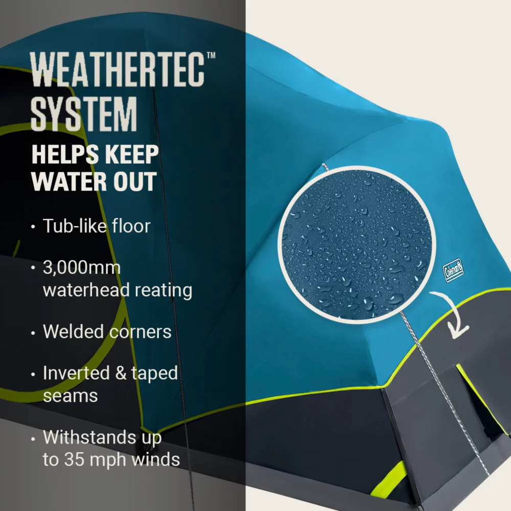• BLOCKS WIND AND RAIN: WeatherTec™ system’s tub-like floor, welded corners, waterproof 3,000mm waterhead fabric, and inverted seams and taped seams on rainfly and tent body help keep water from getting in; strong frame has been tested to withstand up to 35 mph winds