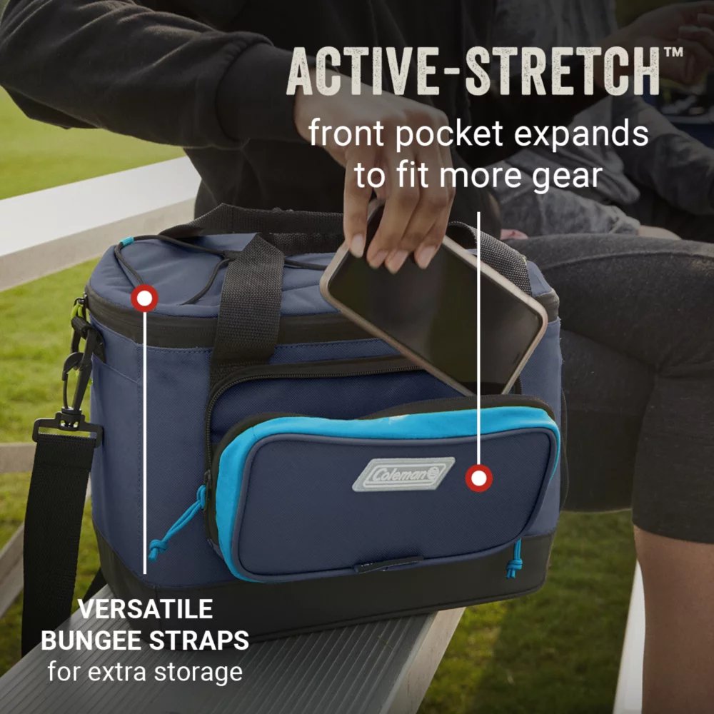 Spectating on the sidelines, tailgating with friends, or spending a day at the beach? The ColemanÂŽ XPAND⢠16-Can Soft Cooler is the perfect cooler for you and your crew. Active-Stretch⢠front pocket expands to fit all your gear throughout the day so you can grab your phone, keys, or other personal items with no problem and the 4Way stretch side mesh pocket easily fits a water bottle. The padded top handle makes the cooler easy to carry from your car to the beach or the sidelines. All-day tailgating? Food and drinks stay cold up to 24 hours so you’ll always have your favorite snacks and beverages at hand. You can feel confident using this cooler again and again thanks to the antimicrobial leakproof liner that helps prevent odor, mildew, and mold from forming.